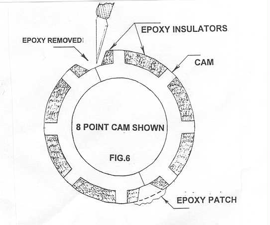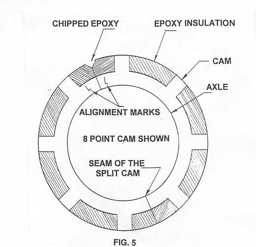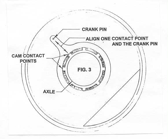 INSTALLATION INSTALLING YOUR SOUND CAM IS VERY EASY BUT PLEASE DONT GET IN A HURRY. READ THESE INSTRUCTIONS ALL THE WAY THROUGH BEFORE STARTING, THEN TAKE EACH STEP ONE BY ONE. THE CAM WILL BE ATTACHED TO THE AXLE WITH AN ELECTRICALLY CONDUCTIVE EPOXY; WE HAVE DONE MANY OF THE INSTALLATIONS WITH THIS EPOXY AND HAVE BEEN 100% SATISFIED WITH THE RESULTS. FIRST THING TO DO IS TO DETERMINE WHICH AXLE OF THE LOCOMOTIVE THAT YOU WANT THE CAM ON. SOME OF THE MOST RECENT BRASS MODELS COME WITH A CAM, USUALLY SQUARE (UNLESS IT IS A SHAY, HEISLER OR CLIMAX). (SEE FIG. 1) THIS TYPE OF CAM REQUIRES YOU TO LET THE WIPER HANG OUT IN THE AIR SO THAT ONLY THE TIPS OF THE CAM TOUCH. THEY DO WORK, BUT ARE SOMETIMES HARD TO ADJUST AND NOT AS EFFICIENT AS A ROUND CAM. IF YOU HAVE ONE OF THESE ON THE AXLE, SIMPLY REMOVE THE WHEEL/AXLE ASSY AND CUT THE CAM OFF WITH A CUTTING DISK. (SEE FIG. 2) NOTE: REMOVE THAT WHEELSET ONLY. TAKE THE SCREWS OUT OF THE SIDE RODS (IF APPLICABLE) AND LEAVE EVERYTHING INTACT SO YOU CAN PUT IT BACK TOGETHER EXACTLY. IF YOUR ENGINE RUNS GOOD, DONT TAKE THE CHANCE OF CROSSING SIDE RODS FROM SIDE TO SIDE. IT SHOULDNT, BUT SOMETIMES IT MAKES A DIFFERENCE, ESPECIALLY IN STANDARD ROD LOCOMOTIVES. WHEN INSTALLING A CAM ON A SHAY, HEISLER OR CLIMAX LOCOMOTIVE, YOU MAY NOT HAVE TO REMOVE THE WHEELSET FROM THE TRUCK. SIMPLY REMOVING THE TRUCK FROM THE LOCOMOTIVE SHOULD GIVE YOU PLENTY OF ROOM TO INSTALL THE CAM. WHEN REMOVING THE OLD CAM, CUT ALL THE WAY DOWN TO THE AXLE ON ONE SIDE THEN DO THE OTHER SIDE. BE CAREFUL NOT TO CUT INTO THE AXLE TOO MUCH. AVOID CUTTING THE AXLE AT ALL IF POSSIBLE. IF YOU DO CUT OR SCAR THE AXLE, IT IS OK, THE G.M.E. CAM WILL STILL FIT AND WORK PERFECTLY. JUST MAKE SURE YOU SMOOTH UP THE AXLE WITH A SMALL FILE BEFORE INSTALLING THE CAM. IF THERE IS NO EXISTING CAM, YOU MUST CHOOSE WHICH AXLE TO INSTALL THE CAM. WHEN USING THE SIX, EIGHT AND TWELVE POINT CAMS, IT SHOULD BE EASY TO CHOOSE ONE. TRY TO CHOOSE ONE FOR EASE OF INSTALLATION OF THE WIPER ALONG WITH THE CAM. LOOK CAREFULLY AND PLAN THE INSTALLATION BEFORE YOU START. YOU WANT THIS INSTALLATION TO BE EASY AND PERFECT. NOW THAT YOU HAVE CHOSEN THE AXLE FOR THE CAM, REMOVE THAT WHEELSET OR TRUCK ASSY. WITH A PIECE OF FINE EMORY CLOTH OR 600 GRIT SANDPAPER, CLEAN THE AXLE WHERE THE CAM IS GOING TO BE INSTALLED. WHEN GLUING THE CAM ON, YOU WANT THE AXLE TO BE VERY CLEAN. THE ALIGNMENT MARKS LOCATE THE ALIGNMENT MARKS ON THE CAM. (SEE FIG. 5) THEY ARE VERY SMALL AND MUST BE TOGETHER WHEN THE CAM IS INSTALLED. IF THEY ARE NOT CORRECTLY ALIGNED, THE CHUFF OF THE CAM WILL BE INCORRECT!!!!!!!! GLUING THE CAM WHEN GLUING THE CAM ON, PUT A SMALL AMOUNT OF ELECTRICALLY CONDUCTIVE EPOXY ON THE AXLE AND PUSH THE CAM ON THE AXLE. BE VERY CAREFUL NOT TO USE TOO MUCH OF THE EPOXY. IF THE EPOXY SHOULD FILL THE GAP COMPLETELY AND SQUEEZE OUT OF THE SEAMS WHERE THE CAM IS PUT TOGETHER, IT COULD ADD AN ADDITIONAL CHUFF WHERE THE SEAMS ARE. YOU WANT JUST ENOUGH TO FILL IN AROUND THE AXLE. IF SOME DOES COME UP THE SEAMS, DONT WORRY ABOUT IT, WE WILL DISCUSS LATER HOW TO EASILY CORRECT IT. WHEN INSTALLING THE CAM ON A ROD LOCOMOTIVE LIKE A HEISLER, ALIGN ONE OF THE CAM CONTACT POINTS SO THAT IT IS ALIGNED WITH THE CRANK PIN. (SEE FIG.3) ON A SHAY LOCOMOTIVE IT IS NOT CRITICAL. IT CHUFFS SO FAST THAT YOU CANT NOTICE THAT IT IS NOT IN PERFECT SYNC WITH THE CRANKSHAFT OF THE ENGINE. INSTALL THE CAM ON THE AXLE THAT YOU HAVE CHOSEN AND MAKE SURE IT IS PROPERLY SEATED ALL THE WAY DOWN. WE LIKE TO PUT A CLOTHESPIN OVER THE CAM TO HOLD IT TOGETHER WHILE THE EPOXY CURES. (SEE FIG. 4) PUT THE AXLE IN A SAFE PLACE WHERE NO ONE (EVEN CATS AND DOGS) WILL NOT TOUCH IT. LET THE EPOXY CURE COMPLETELY BEFORE MOVING ON TO THE NEXT STEP!!! NOW THAT THE CAM IS INSTALLED, IT MAY BE NECESSARY TO REPAIR THE EPOXY WHERE THE SEAMS OF THE CAM ARE. IF SOME HAS CHIPPED OFF (SEE FIG. 5) SIMPLY USE SOME NON-CONDUCTIVE EPOXY TO REPAIR IT. (THE 5 MINUTE VARIETY WORKS GOOD AND FAST) IF YOU HAD TO MAKE A REPAIR, LET THE EPOXY CURE COMPLETELY BEFORE MOVING ON TO THE NEXT STEP!!! IF YOU MADE A REPAIR, CAREFULLY FILE OR USE AN EMORY BOARD TO ROUND AND SMOOTH THE REPAIR. TRY TO KEEP IT AS ROUND AS POSSIBLE. DONT GO CRAZY WITH THE FILE! MAKE SURE THAT YOU GET THE CAM FAIRLY SMOOTH AND THAT ALL OF THE CONTACT POINTS ARE CLEAN OF THE EPOXY. A FINAL POLISHING OF THE CAM WITH SOME 600 GRIT SANDPAPER WILL MAKE THE CONTACT POINTS SMOOTH. REINSTALL THE WHEELSET AND YOU ARE READY TO TEST THE CAM INSTALLATION. WHEN INSTALLING THE WIPER, USE SOME PRESSURE AGAINST THE CAM BUT NOT TOO MUCH. YOU WANT ENOUGH PRESSURE TO MAKE GOOD CONTACT BUT NOT ENOUGH TO DAMAGE THE CAM OR THE WIPER. ALSO, THE CAM COULD HAVE SOME AMOUNT OF WOBBLE OR UP AND DOWN HOP TO IT IF IT MOVED DURING THE INSTALLATION PROCESS. DONT WORRY ABOUT IT, IT WILL PROBABLY WORK FINE. INSTALL THE WIPER AND THE CHUFF CAPACITOR AND TRY IT. IF YOU GOT ALL THE EPOXY OFF THE CONTACT POINTS AND SMOOTHED THEM UP IT SHOULD WORK PERFECTLY, WOBBLE OR NOT. IF YOU GET AN EXTRA CHUFF BEAT WHEN RUNNING THE LOCOMOTIVE, IT IS POSSIBLE THAT THE ELECTRICALLY CONDUCTIVE EPOXY CAME UP THE SEAMS OF THE CAM AND IS PROVIDING AN ADDITIONAL ELECTRICAL PATH FOR THE WIPER. THIS IS VERY SIMPLE TO REPAIR. AGAIN REMOVE THE AXLE FROM THE LOCOMOTIVE AND WITH YOU MODELERS KNIFE; CUT OUT THE EPOXY AS SHOWN IN THE AREA OF THE SEAMS. (SEE FIG. 6) MIX SOME OF THE NON-CONDUCTIVE EPOXY AND FILL THE GAPS THAT YOU CUT OUT. AFTER THE EPOXY HAS COMPLETELY CURED, REROUND THE CAM, SLIGHTLY POLISH IT WITH SOME 600 GRIT SANDPAPER AND REINSTALL THE WHEELSET, THE EXTRA CHUFFS SHOULD BE GONE. AS ALWAYS, WE WELCOME YOUR COMMENTS AND SUGGESTIONS ON THIS INSTALLATION.